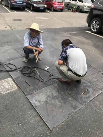 8月8號上午,蕭山區河道辦兩個維修師傅帶著電焊槍等工具,前來蕭山商業城將原先的窨井蓋鉚釘重新焊接、消除了安全隱患。