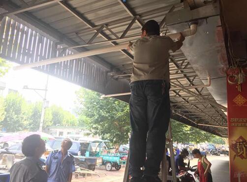 蕭山商業城華東副食品市場水電人員及時做好暴雨后的做好補漏工作,他們頂著烈日更換水管,汗水開始從頭上一滴滴落下,僅僅十幾分鐘,他們的上衣就已經濕透了。