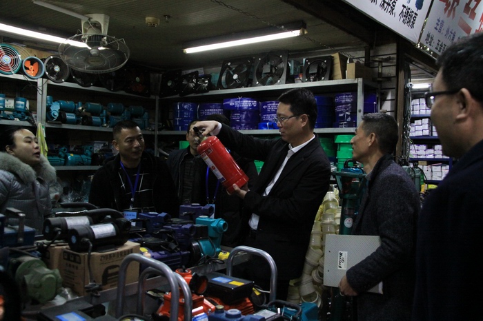 在五金市場,董事長對場內的消防設施設備進行了解,特別關注經營戶使用滅火器的情況,要求必須戶戶懂得用、人人會使用。