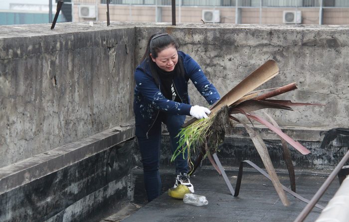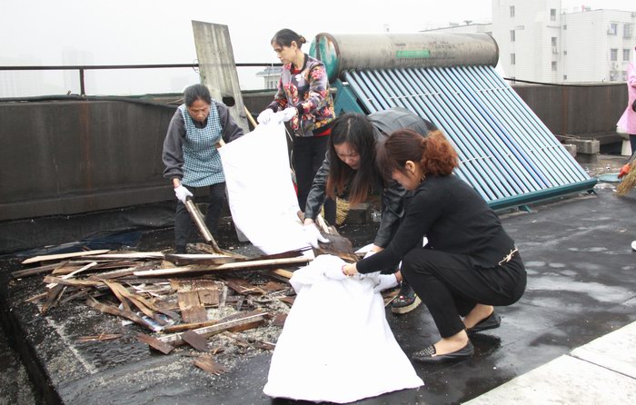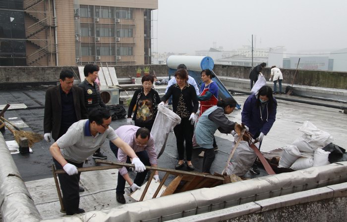 當天下午在商住辦工作人員的帶領下,各住宅樓樓道組長及清潔工等24人,大家拿著掃帚、鐵鍬、火鉗等工具齊心協力,發揮不怕臭、不怕累的精神,對轄區范圍內占用公共通道上堆放的雜物及亂扔在服裝市場屋頂平臺上的泡沫箱、坐便器、廢棄的床墊等臟物、衛生死角進行清掃、搬運。特別是對各下水管道上堆積的淤泥進行了鏟除,并對各堵塞的下水管道口進行了疏通,以防在“梅雨”季及臺風天等惡劣天突襲時下水通暢。本次活動共清理了雜物30余件、垃圾50多袋,改變了樓道環境臟、亂、差的問題。