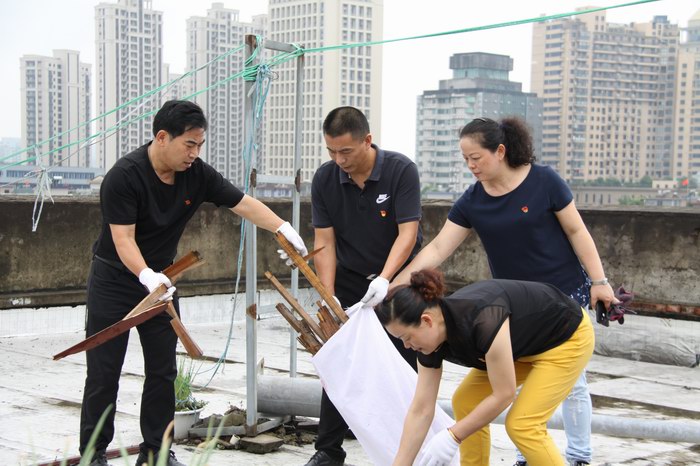 大家拿著掃帚、鐵鍬、火鉗、榔頭等工具齊心協力,發揚不怕臭、不怕累的精神,對轄區范圍內占用公共通道上堆放的雜物及亂扔在服裝市場屋頂平臺上的泡沫箱、坐便器、廢棄的床墊等臟物、衛生死角進行清掃、搬運。特別是對各下水管道上堆積的淤泥進行了鏟除,并對各堵塞的下水管道口進行了疏通,以防在“梅雨”季及臺風天等惡劣天突襲時下水通暢。本次活動共清理了大件雜物20余件、垃圾70多袋。