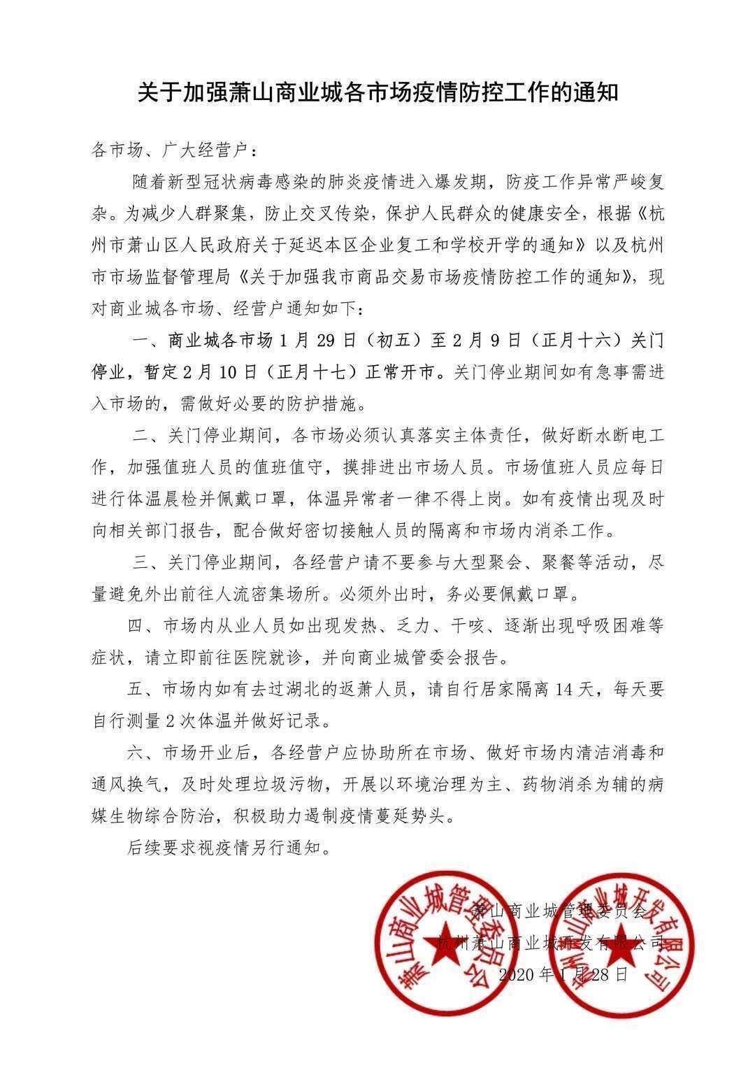 因疫情影響,蕭山商業城開業時間延后至2月10日(正月十七),望各位知悉。