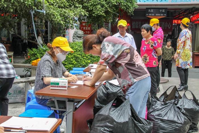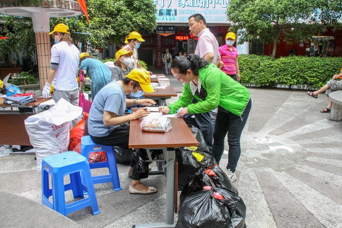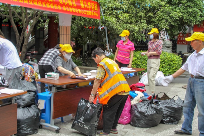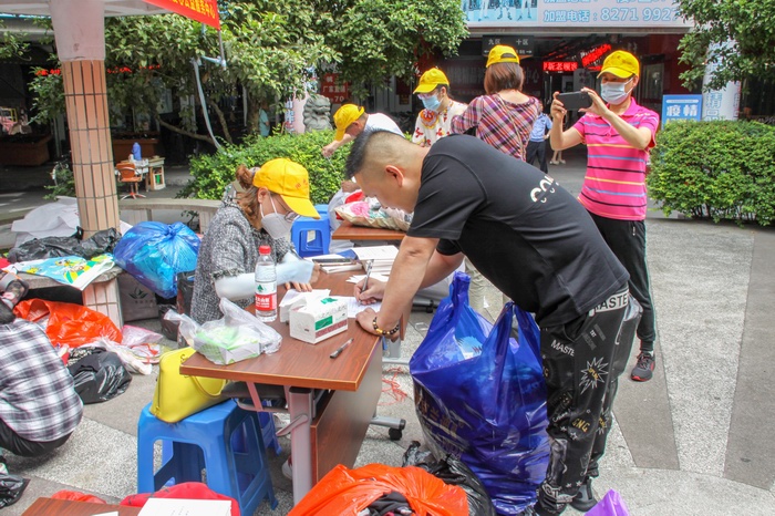 是日早上8:30活動現場,商業城內的經營戶陸續來到服裝市場圓盤處捐贈衣物,他們手里拎著一袋又一袋衣服和褲子,臉上掛滿笑容。黨員們幫助經營戶一起將捐贈衣服拿到捐贈點,清點衣物,統計數據。很快,活動現場的捐贈衣物就已經堆積如山了。