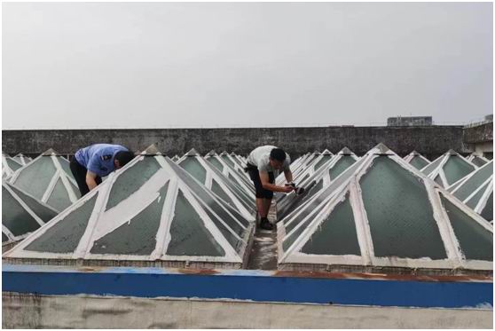 由于市場玻璃頂棚接縫處涂料干裂,有輕微滲水情況。雨停后,管理人員立即上屋頂對滲水處進(jìn)行修補(bǔ),讓經(jīng)營戶貨物免受損失。