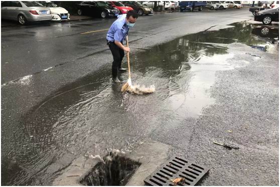 管理人員對屋頂雨水管道進(jìn)行檢查將樹葉、垃圾等堵塞物清理干凈,對積水路面進(jìn)行清掃,保障行人安全。