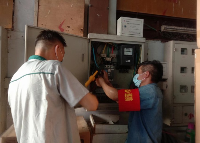 因市場線路陳舊、設備老化,對設備更換工作帶來了一定的難度,綜合部副經理沈立與水電工們耐心的對電氣設備進行檢測,仔細的拆裝電線、接觸器、空氣開關等設備零件,保證換新設備正常運轉并處于良好的狀態,經過為期一周的辛勤工作,順利完成了各市場電器設備換新。