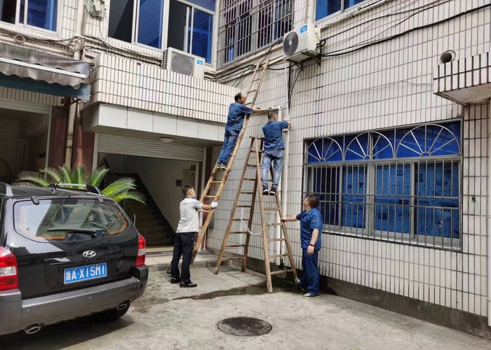 為此,綜合部聯系供電、電信等多家單位工作人員到現場實地勘察線路,劃清各自線路走向,明確清理思路。隨后,綜合部召集市場電工一道對雜亂線路進行了集中整理,現場工作人員將老舊不用的線路去除、剪斷,對留用的線路進行重新扎捆固定,在梳理過程中細致檢查各線路的老化程度,逐一排查線路安全隱患。同時,綜合部對樓內破損遮陽篷進行更換,并清洗了入口玻璃門臺。