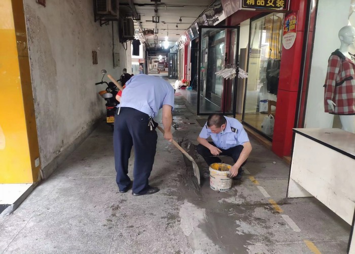 因市場主體樓建造年代已久,長久使用的市場內(nèi)通道路面就出現(xiàn)破損情況,路面破損坑洼不平、通行不便存在隱患。針對這一情況,服裝市場組織管理員對9區(qū)1樓35號前通道進行維修,清除破損路面的碎石、攪拌混泥土、修補路面,并立好警示標志,確保市場內(nèi)部環(huán)境整潔有序。