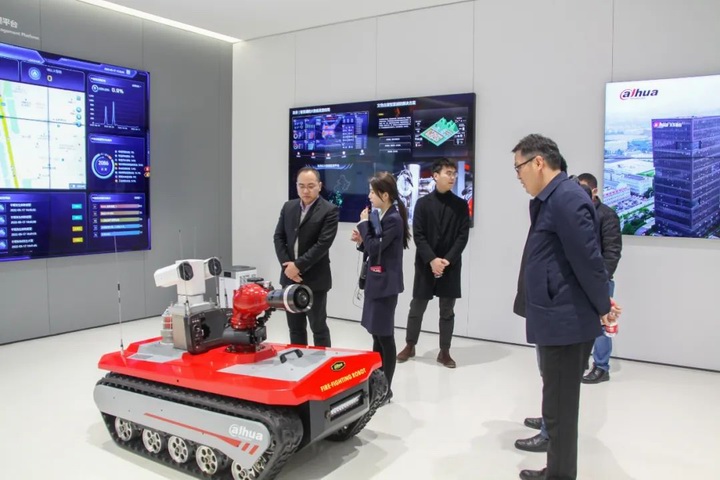 隨后,來到位于濱江的浙江大華技術股份有限公司,參觀人員在現場工作人員的陪同和講解下,觀摩了大華公司各類產品展廳,悉心聽取了機器視覺、視頻協作、智慧消防、智慧儲存、智慧顯示、智慧控制等各門類產品的技術構成及推廣應用情況。