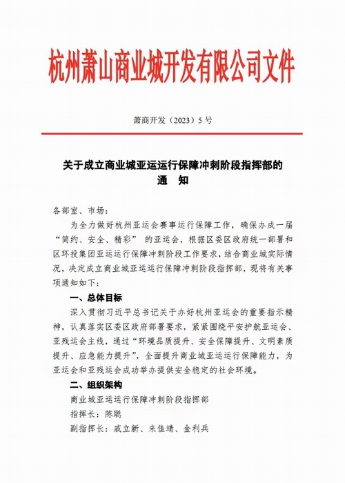 ▲ 公司第一時間制定了商業城亞運運行保障沖刺階段工作方案,成立指揮部,明確責任領導、責任部門、工作職責和各項工作的時間節點。
