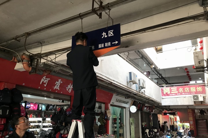 清潔市場1-2樓指示標牌。管理人員3人一組,用事先準備好長梯子、毛巾、鏟刀、小水桶、拖把,先除塵、然后用帶水毛巾擦洗,最后對擦洗時殘留在地面的污水用拖把吸附干凈。經過清洗,市場指示標牌整潔、干凈、亮麗如新。