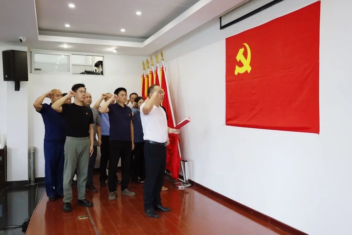 陳聰帶領(lǐng)4-6月份入黨的黨員同志重溫入黨誓詞,并送上生日寄語。