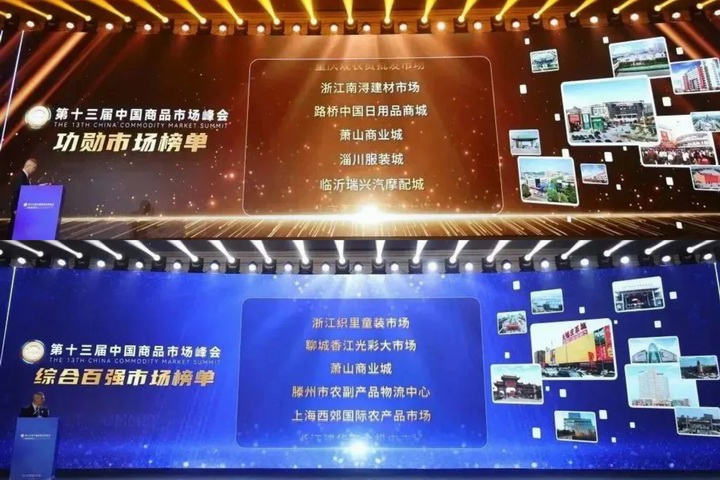 在大會上,蕭山商業城被授予“中國商品市場功勛市場”和“中國商品市場綜合百強”兩項榮譽稱號。