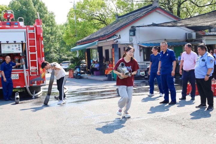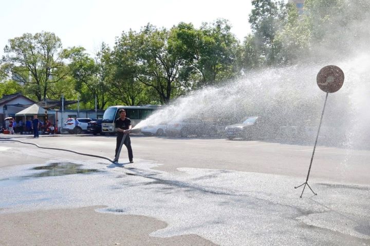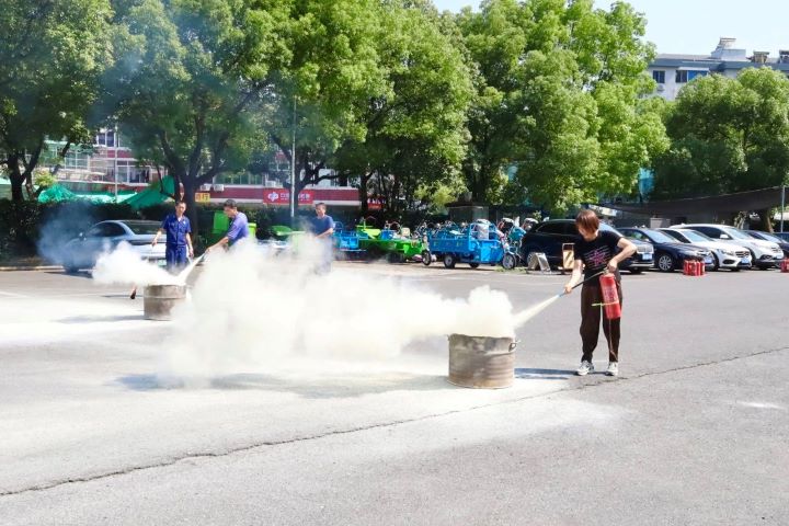 演練分為兩個項目,首先是手持滅火器撲救油桶火災,參與者們在專業指導下迅速而準確地使用滅火器將火焰撲滅,展示了高效的個人應急反應能力。緊接著是兩人協作的水帶連接出水打靶環節,這一項目考驗了團隊之間的配合以及對消防設備的操作熟練度。