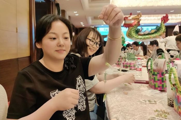 小小一株草,其實是個寶。這就是艾草,擁有驅蚊辟邪的超能力!現場工作人員簡單講解制作流程和注意事項后,將制作材料分發到參賽選手手中,隨后大家按照示范步驟開始制作。
