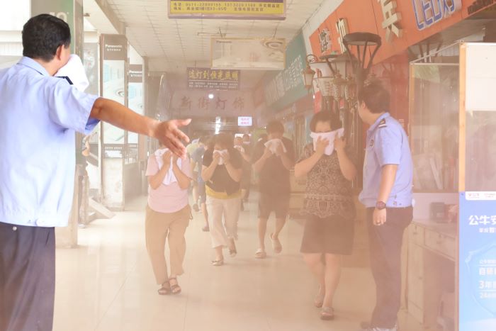 演練模擬建材市場二樓一處營業(yè)房門口發(fā)生火災,伴隨著濃煙,火勢迅速蔓延。市場接到消控中心火警描述后,市場經(jīng)理及區(qū)塊管理員迅速到達現(xiàn)場,通知電工斷電并帶領現(xiàn)場經(jīng)營戶、住戶、消費者,根據(jù)應急預案設定的疏散路線,手持濕毛巾捂住口鼻,彎腰低姿進行疏散逃生。在市場管理員的疏散引導指揮下,逃生人員快速有序的抵達緊急疏散集合點。