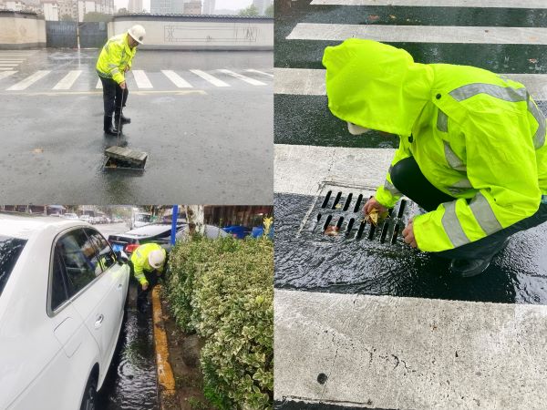 在巡查中發現,部分路段出現小范圍積水情況,為避免造成經營戶、消費者出行困難和交通安全隱患,工作人員身著雨衣雨靴,手持鐵鍬等工具,對受堵路段排水井進行垃圾清理和疏通。截止目前,路面積水已基本清除。