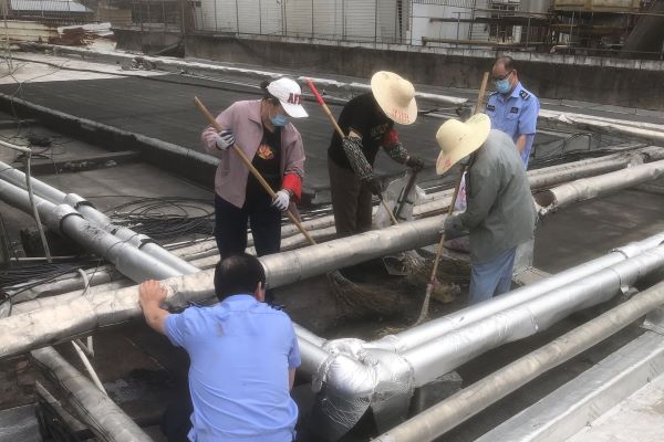 為提升商業城服裝市場的衛生環境,進一步消除屋頂安全隱患。5月15日,服裝市場組織管理人員與清潔工對樓頂屋面垃圾和雜物亂堆放的現象開展了一次整治清理行動。